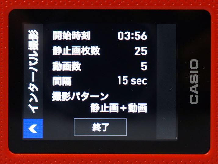 インターバル撮影中にコントローラー部のボタンを押すと、モニターに現時点での撮影数が表示される。この画面で「終了」をタップすると、インターバル撮影が終了