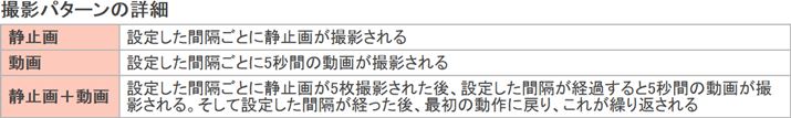 撮影したい間隔と、静止画や動画などの撮影パターンをそれぞれ設定する