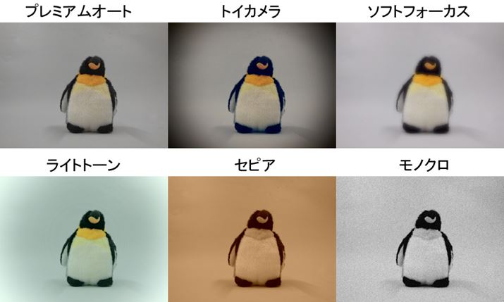 周辺を暗くしてトイカメラ風に色合いが変わる「トイカメラ」、幻想的な仕上がりになる「ソフトフォーカス」といった一般的なデジタルカメラに搭載されているアレンジできるモードを備えている。「ライトトーン」は、コントラストを弱めにして撮影するモードだ