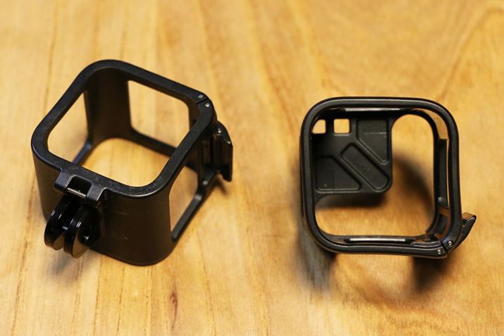 上でHERO4 Sessionに装着すると紹介した、マウントフレーム。ハウジングは不要だが、身体や乗り物に付けるために必要なアクセサリーにセットする際に必ず装備しなければならない。2種類用意されており、装着したい向きなどにあわせて使い分ける