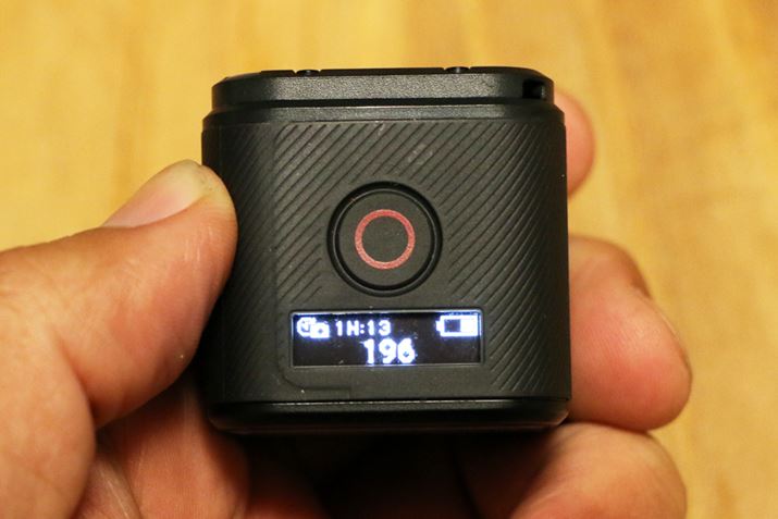 天面にあるボタンを押すと電源がONになり、同時に録画がスタート。録画中にボタンを押すと、録画停止→電源OFFとなる。さらに、長押しで「タイムプラス(コマ撮り)撮影」が開始。ボタン下にあるディスプレイでは、録画時間やバッテリー残量などがチェックできる