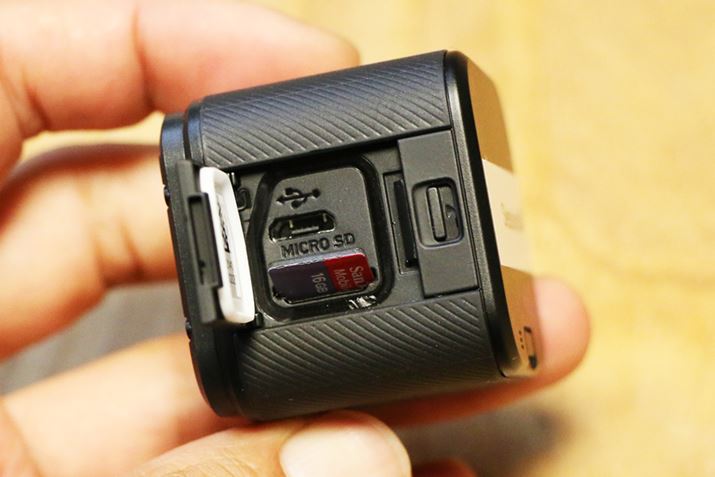 録画するためのmicroSDカードを入れるためのスロットは、側面に装備。マウントフレームを装着した状態でも、カバーの開閉は可能だ。また、バッテリーは内蔵式となっており、交換は不可。満充電状態で最大2時間連続撮影できる