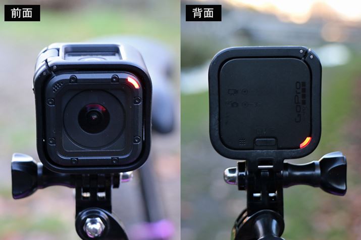 録画がスタートすると前面・背面のLEDが赤く光るので、録画されているかが確認できる。ちなみに、電源がOFFの状態でもバックグラウンドでWi-FiがONになっているとLEDが青く点滅するので、Wi-FiをONのまま放置してしまって電池切れ……というような事態を招きにくい
