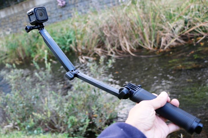 自撮り棒のように使える「3-Way」というアクセサリー(別売)に装着し、川の中を撮影してみる。「3-Way」は、折りたたんで1/3の長さにすることも可能