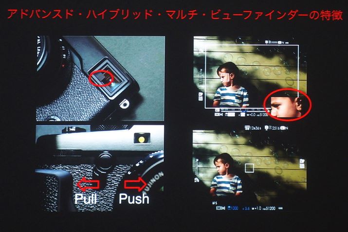 従来モデルX-Pro1では、電子ビューファインダー(EVF)と光学ファインダー(OVF)を切り替えて利用できる画期的な「ハイブリッドビューファインダー」が注目を集めたが、X-Pro2でもこの仕組みは継承。「FUJIFILM X100T」で採用された、光学ファインダー上にEVFの小窓を同時表示する「エレクトロニックレンジファインダー(ERF)」が追加され、3種類のファインダー表示を選択できる「アドバンストハイブリッドマルチビューファインダー」に進化している。