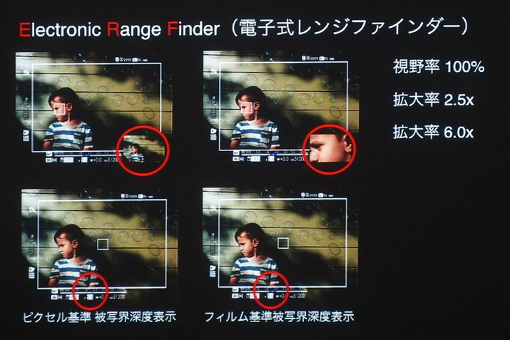 ERFでは、「視野率100%」「2.5倍拡大」「6倍拡大」の3通りの表示を選択可能。被写界深度スケールでは「フィルム基準」を利用できるというこだわりよう