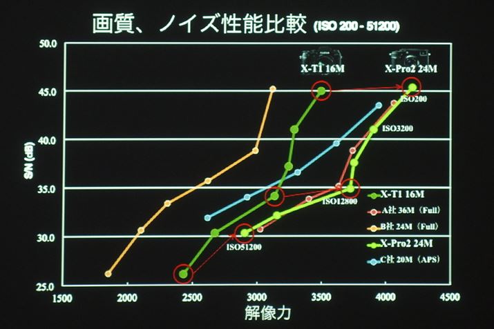 富士フイルムが感度別の画質・ノイズ性能(解像力とSN)を検証した結果のグラフ。X-Pro2は一眼レフスタイルのフラッグシップ「FUJIFILM X-T1」以上で、36M画素のフルサイズ機と互角の性能を持つとし、実際の画素数を上回る解像力を実現したとアピールした