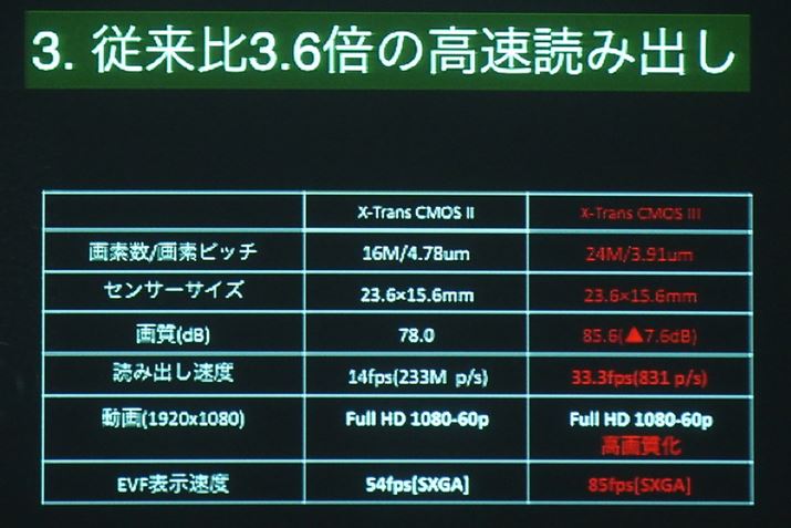 X-Trans CMOS IIIは従来のX-Trans CMOS IIと比べて約3.6倍の高速読み出しが可能。読み出し速度は33.3fpsとなる