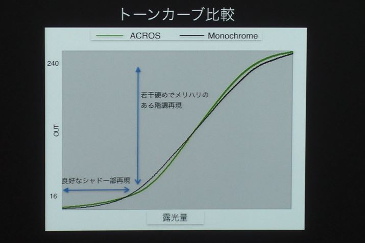 ACROSと従来のモノクロモードのトーンカーブを比較。ACROSはシャドーを少し持ち上げ、中間調からはコントラストを高める設定になっているとのこと