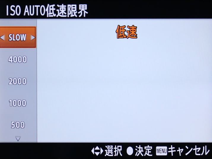 オート感度時の低速限界設定。自分の手ブレしない限界のシャッタースピードを設定しておくことで、より低感度で手ブレのない撮影が可能になる