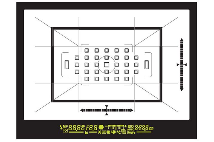 ファインダー内のイメージ。33点の測距点がワイドに配置されている。内側の黒線はクロップ撮影時に表示される枠