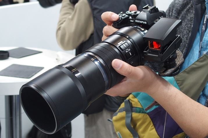 オリンパスのブースでは、オリンパスの光学技術を詰め込んだという超望遠・単焦点レンズ「M.ZUIKO DIGITAL ED 300mm F4.0 IS PRO」を、ドットサイト照準器「EE-1」と組み合わせた状態で試写することができた。このレンズは、35mm判換算で600mm相当の画角で、開放F4というスペックながらコンパクトな筐体を実現しているうえ、強力な手ブレ補正機能を搭載しており、手持ちでも被写体をしっかりと捉えて撮ることができる