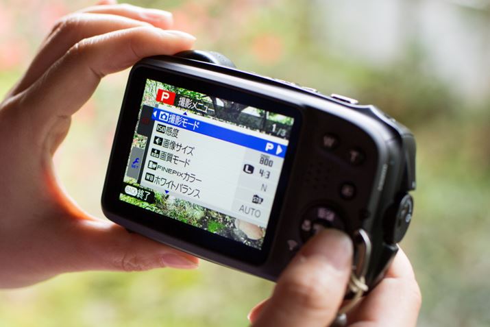 FinePix XP90はアウトドア派用というイメージから、もっとごっついかと思いきや、見た目はいたって普通のコンデジ。むしろこんな小さなボディで、水中や吹雪(雪?)、砂漠(砂?)といった過酷な環境に本当に耐えられるのだろうかというのが、筆者の第一印象。スペック表によると、15mの防水、−10度の耐寒、1.75mの耐衝撃構造、そして防塵性能を持つとのことだが、この見た目からはイメージが沸かないのだ。とはいえ、バッテリーカバーがロック式になっていたり、手持ちの部分に滑り止めのグリップが付いていたりと、ちゃんとアクティブシーンを想定した作りになっている。この滑り止めのグリップは意外と筆者には重宝するかも。というのも、筆者はスマホはしょっちゅう落としており、いつかデジカメも落とすかも……という不安が常にあったからだ。