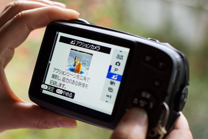では、早速撮影開始。撮影メニューから撮影モードをセレクトする。被写体にカメラを向けるだけで、カメラが自動で撮影シーンを認識し、最適な設定にする「シーンぴったりナビ」、カメラがシャッタースピードと絞り値を自動的に設定する「P=プログラム」、アクションシーンを広角で撮影し、迫力のある映像を記録する「アクションカメラ」、さまざまなフィルター効果を加えた撮影ができる「アドバンストフィルター」など、計22の撮影モードがあるので、シーンに適したモードをセレクトすればよい。