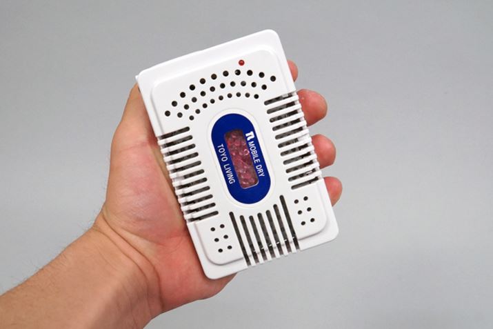 東洋リビング「モバイルドライ 除湿ユニット MD-2」。白を基調とした長方形のボディを採用し、本体サイズは116(幅)×33(高さ)×76(奥行)mm。内部に乾燥用ノシリカゲルが入っており、振るとシャカシャカ音がする