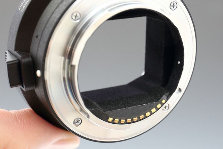 電子接点を持つアダプターで、オートフォーカスや手ブレ補正の動作が可能。鏡筒内部にはレンズ性能の低下を防ぐための植毛処理が施されている