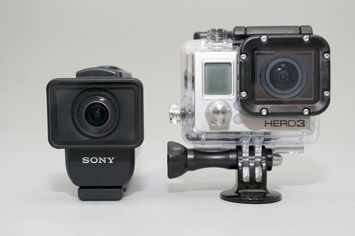 ソニーのFDR-X3000とGoPro HERO3 Black Editionの大きさを比べたところ。防水ハウジングケースに入れた状態でこれだけのサイズの違いがある