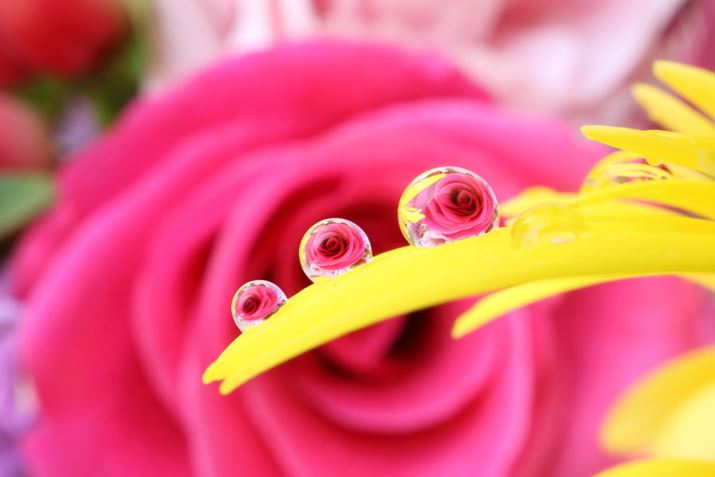 花が映り込む水滴をスーパーマクロモードで撮影した1枚