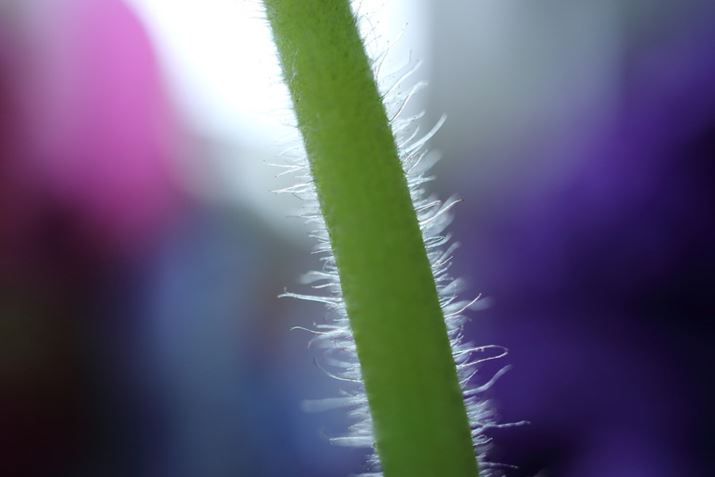 花の茎の産毛を逆光でマクロ撮影。絞り開放なので被写界深度は浅いがピントの合った産毛はシャープに写っている。こちらも手持ちで撮影している