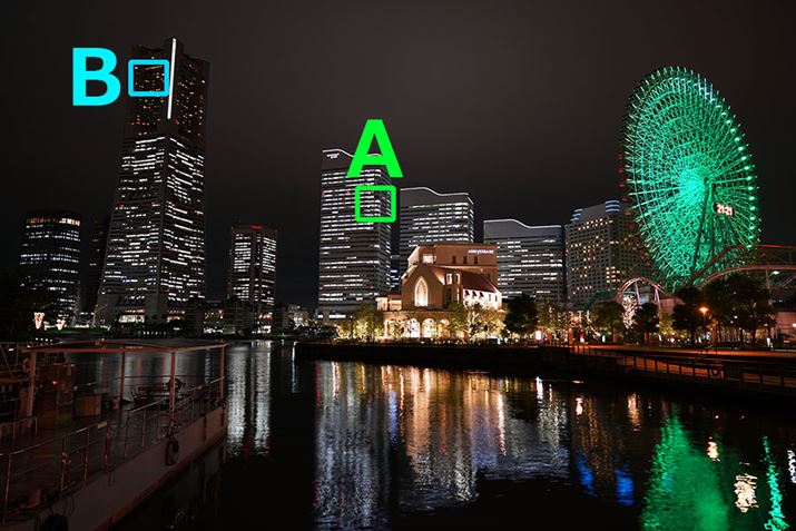 焦点距離24mmでの比較作例のサムネイル。A:緑枠、B:青枠が等倍で切り出した部分。撮影設定は、ホワイトバランス:蛍光灯(白色)、Dレンジオプティマイザー/オートHDR:切、クリエイティブスタイル:スタンダードとなる