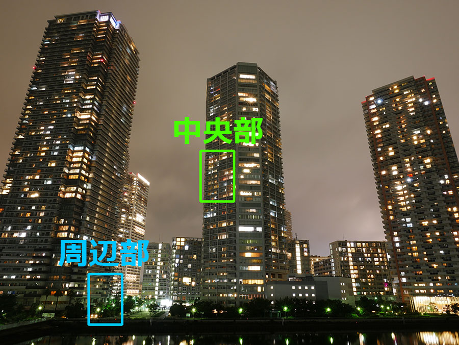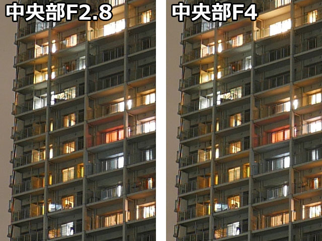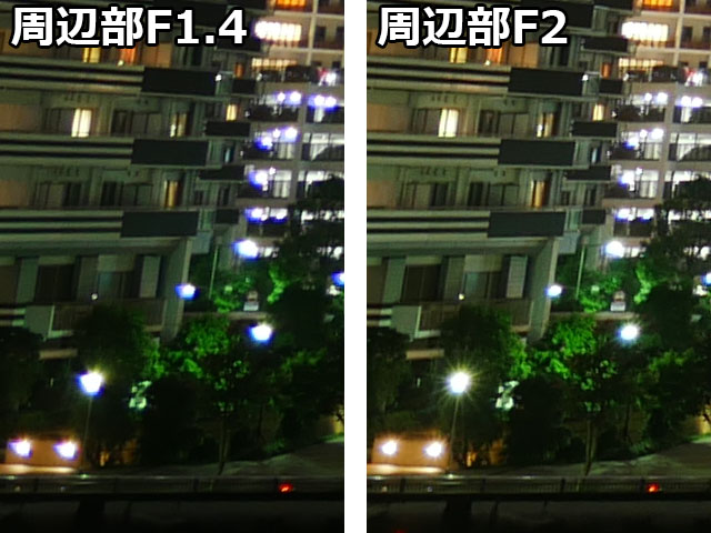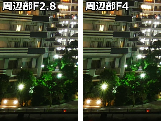 この比較作例では、点光源の描写をチェックしてほしい。画面中央部を見ると絞り開放からシャープな描写となっており、高い性能を持つ広角レンズであることがわかる。周辺部では、絞り開放だと細かいところでコマ収差が見られるものの、1段絞ってF2になると大幅に抑えられるようになる。F2.8まで絞ると気になるような像の流れやにじみは見られなくなる。