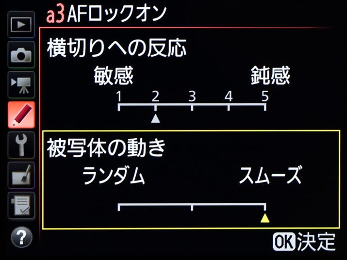AF-C時の追従特性を設定できるAFロックオンの画面。「横切りへの反応」では、カメラ前を横切る障害物へのオートフォーカスの反応を調整できる。「被写体の動き」は、「ランダム」が被写体の動きの速度が急激に変わる場合を、「スムーズ」がゆるやかな速度変化で動く場合を想定した設定となる