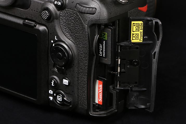 XQDメモリーカードとSDメモリーカード(SDHC/SDXC UHS-II対応)のダブルカードスロットを採用。XQDカード使用時はRAW記録でも200コマまでの連続撮影が可能となっている
