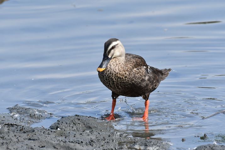 陸に上がってきたカルガモ。くちばしの質感がうまく表現されている