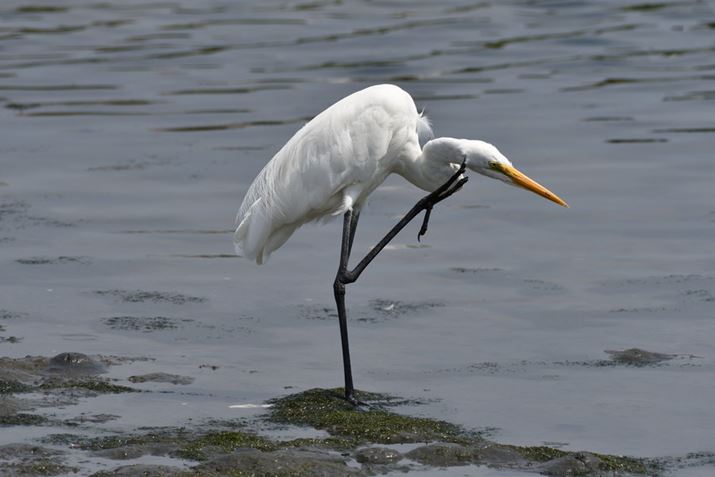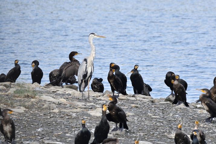 カワウの群れの中にいるアオサギを望遠端で撮影