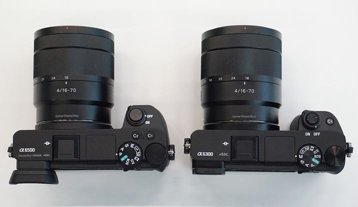 左がα6500で、右がα6300(※α6300はアイピースカップ非装着)。グリップが深い形状に変更されたほか、上面にカスタム(C2)ボタンが追加された。レリーズボタンも大きくなっている