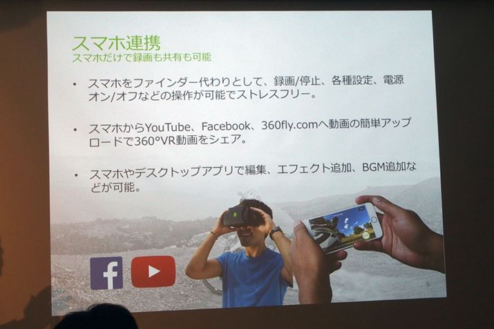 また、撮影した映像への効果や音声トラックの追加といった編集機能や、撮影したデータをダイレクトにYouTubeやFacebookなどのSNSにアップしてシェアできる機能、撮影した映像をアプリからワンタップでVRモードに変換できる機能なども搭載。VRモードに変換した動画は、一般的なVRヘッドセットで楽しむこともできる。パソコン向けの無料デスクトップアプリも用意されているというが、スマートデバイスだけで、撮影から編集、映像をシェアしたり楽しむといったところまでカバーできる点はかなりうれしい。