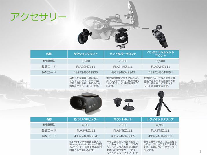 また、車載用途などに使える「サクションマウント」や、自転車やバイクのハンドルに取り付けられる「ハンドルマウント」、通気式ヘルメットに装着できる「ベンテッドヘルメットマウント」、三脚にもなる「トライポットグリップ」など、360flyシリーズ向けに開発さてた多数のアクセサリーもラインアップされる予定となっている。