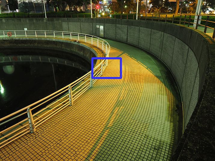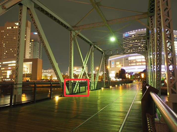 カメラをホールドした状態で、手すりの上にカメラを乗せて撮影した(カメラを直接乗せているわけではなく、ホールドした両手を乗せている)。作例2よりも安定した構えで撮っている。回転ぶれによるものなのか周辺が少し甘い描写になってしまったが、シャッタースピード8秒で撮ったことを考慮すると納得できる画質だ。成功写真は8枚中3枚。