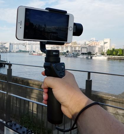 今回取り上げるOsmo Mobileは、3軸に対応した電動式の製品となっている。下記に実際に撮影した映像を掲載するが、非常に安定した滑らかな映像となっている。本体を左右に揺らしてもカメラを水平に保つように各軸が制御してくれるため、映像では揺らしていることがほとんどわからないほどだ。