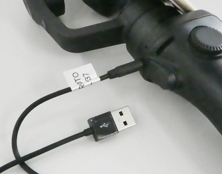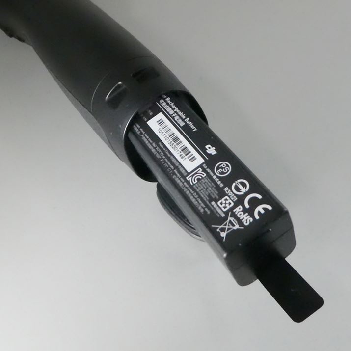 バッテリーは本体の底から挿入する。Osmoシリーズは、バッテリーが統一されているので、別売の充電器を使って充電することもできるが、Osmo Mobileは、バッテリーを入れたまま専用のUSBケーブルで充電することも可能だ