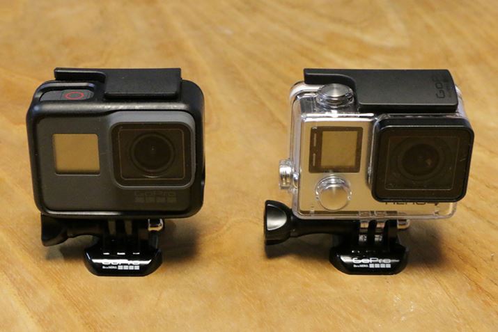 液晶モニターが搭載されても、サイズは従来とそれほど変わらない。「HERO4 Black」(右)よりも「HERO5 Black」(左)のほうが若干サイズは大きいが、その差は各辺2〜3.5mm程度だ