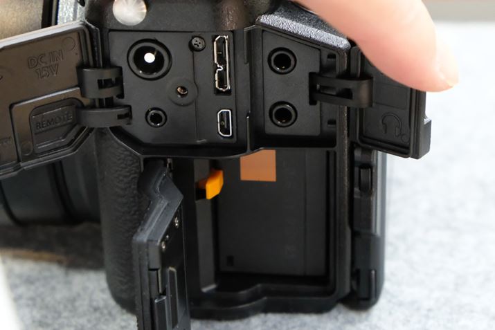 インターフェイス類は左側面に集中しており、DC IN端子、リモートレリーズ端子(2.5mm)、HDMIマイクロ端子(Type D)、 USB3.0対応マイクロUSB 端子(Micro-B)、マイク端子、ヘッドホン端子を搭載。シンクロターミナルはボディ前面に配置されている