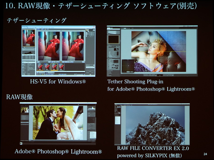 このほか、カメラとパソコンをUSBケーブルで接続して使用するテザー撮影用ソフトとして、「HS-V5 for Windows」と「Tether Shooting Plug-in PRO for Adobe Photoshop Lightroom」を用意(いずれも別売)。RAW現像ソフトは「Adobe Photoshop Lightroom」(別売)が対応するほか、無償ダウンロードが可能な「RAW FILE CONVERTER EX 2.0 powered by SILKYPIX」も用意される。