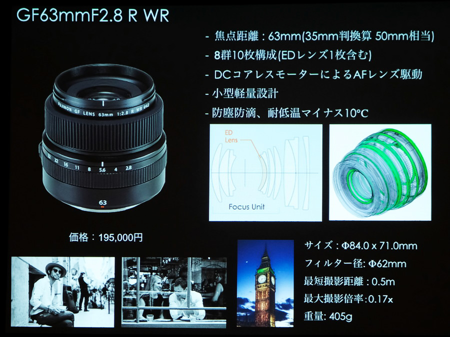 35mm判換算50mm相当の画角となるFUJINON GF63mmF2.8 R WR。レンズ構成はEDレンズ1枚を含む8群10枚。画質を重視し、大きなフォーカスユニットを採用している。価格は195,000円(税別)