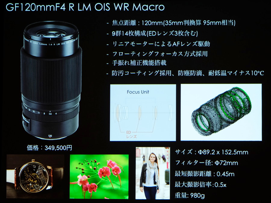 FUJINON GF120mmF4 R LM OIS WR Macro は、35mm判換算95mm相当の画角となる最大撮影倍率0.5倍のマクロレンズ。レンズ構成はEDレンズ3枚を含9群14枚。フローティングフォーカス方式を採用し、マクロから遠景までシャープな描写を実現した。手ブレ補正機能も搭載する。価格は349,500円(税別)