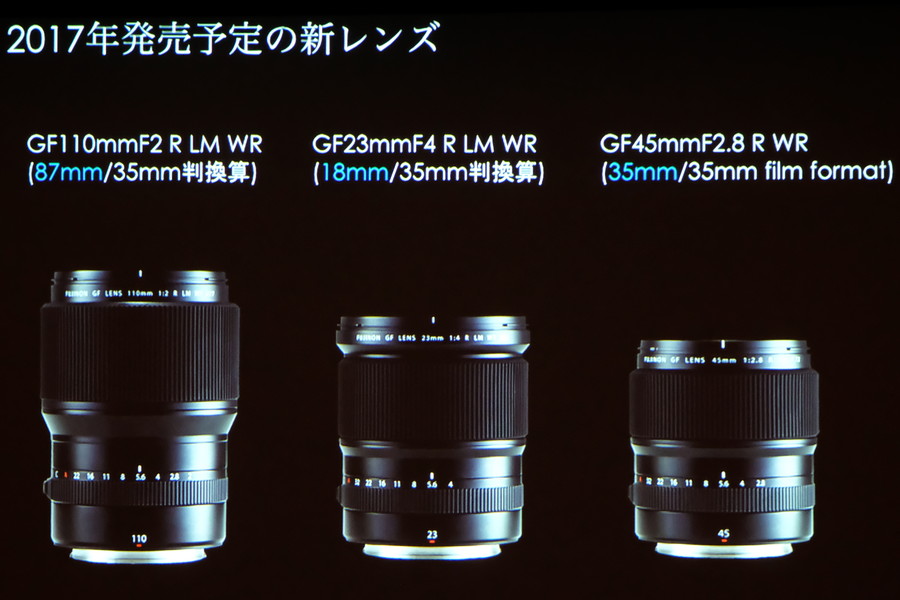 GFX 50Sのボディと同時発売になるGFレンズは、標準レンズ「FUJINON GF63mmF2.8 R WR」、光学2倍のズームレンズ「FUJINON GF32-64mmF4 R LM WR」、マクロレンズ「FUJINON GF120mmF4 R LM OIS WR Macro」の3本となっている。