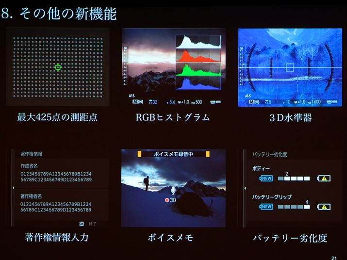 RGBヒストグラム、3D電子水準器、著作権情報の入力、ボイスメモ、バッテリー劣化度などの新機能が備わっている
