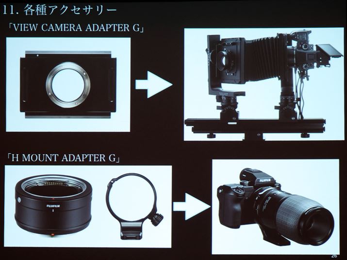 GX645AF用の交換レンズを装着できるH MOUNT ADAPTER G、GFX 50S を4×5ビューカメラのデジタルバックとして使用できるVIEW CAMERA ADAPTER Gも用意