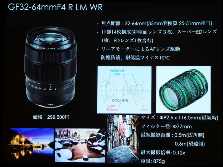 35mm判換算で25〜51mm相当の画角をカバーするFUJINON GF32-64mmF4 R LM WR。レンズ構成は非球面レンズ3枚、スーパーEDレンズ1枚、EDレンズ1枚を含11群14枚。AFレンズ駆動にはリニアモーターを採用する。価格は299,500円(税別)