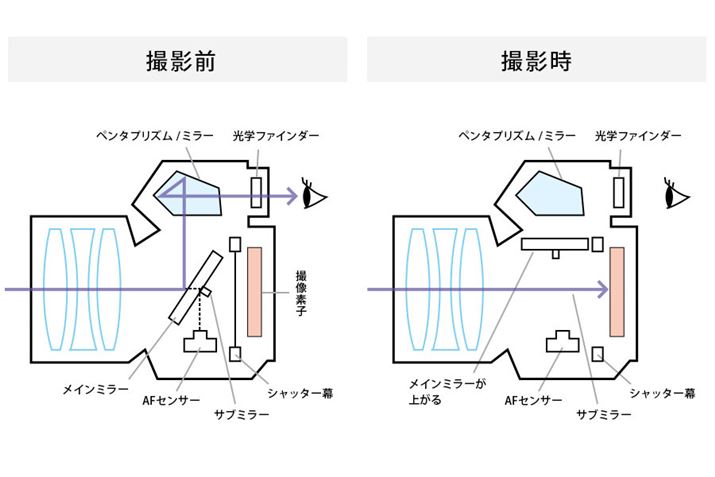 一眼レフの内部構造。一眼レフは内部にミラーやペンタブリズム(もしくはペンタミラー)を搭載し、ミラーの動きによってレンズからの光の届く先が変わります。シャッターを押す前は光学ファインダーに光が届きますが、シャッターを切るとミラーが上がって光が撮像素子に届くようになります