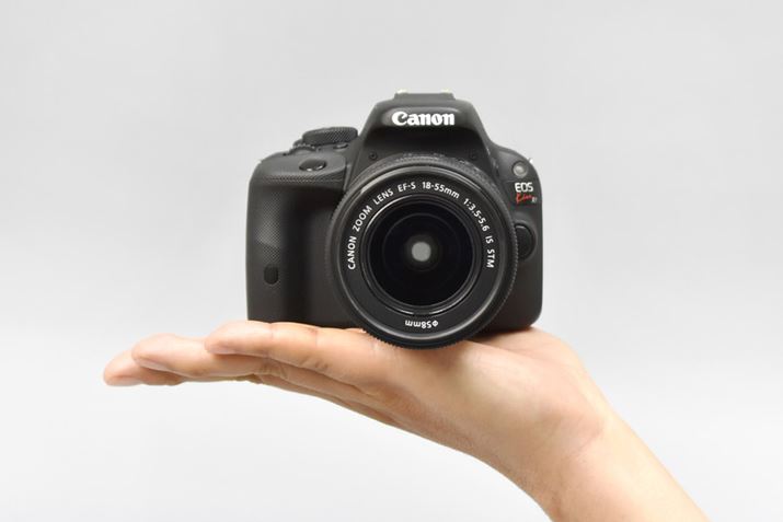 一眼レフは大きくて重いという印象のある方もいるかもしれませんが、最近のエントリー向けモデルはかなりコンパクトになっています。この画像はキヤノンのEOS Kiss X7を手のひらの上に乗せて撮ったものになります