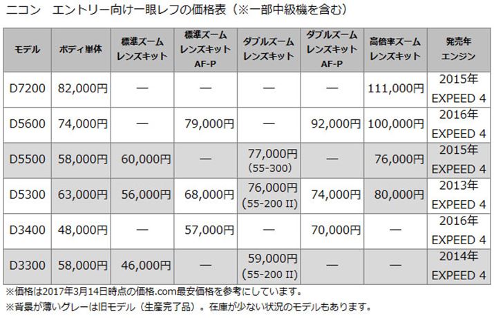 このほか、旧モデルの中ではD5300(の旧レンズキット)とD3300は在庫が少なくなってきています。ボディ単体などは後継モデルを超える価格になっているので注意してください。また、旧モデルのダブルズームレンズキットは、付属する望遠ズームレンズが異なるものが複数用意されているのも注意点です。特にD5300は、AF-Pレンズ「AF-P DX NIKKOR 70-300mm f/4.5-6.3G ED VR」が付属する「AF-P ダブルズームキット」のほかに、望遠ズームレンズとして「AF-S DX NIKKOR 55-300mm f/4.5-5.6G ED VR」が付属する「ダブルズームキット」と、「AF-S DX NIKKOR 55-200mm f/4-5.6G ED VR II」が付属する「ダブルズームキット2」があります。標準ズームレンズのレンズキットも、AF-Pレンズ「AF-P DX NIKKOR 18-55mm f/3.5-5.6G VR」付属の「AF-P 18-55 VR キット」と、旧型レンズ付属の「D5300 18-55 VR IIレンズキット」があり、ややわかりにくくなっています。