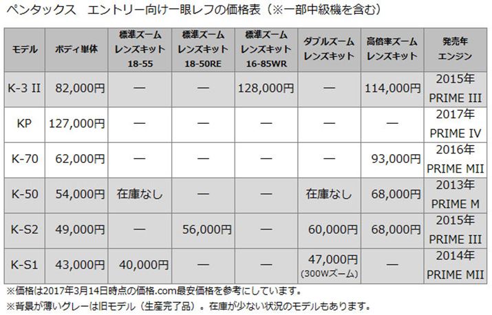 ペンタックスブランドの一眼レフのラインアップはシンプルで、エントリー向けは「K-70」のみが現行モデルとなります。中級機の最新モデル「KP」が2017年2月に登場したこともあってか中上級機「K-3 II」が生産完了品になり、ペンタック全体での現時点の現行品は、35mmフルサイズ機の「K-1」にKPとK-70を加えた計3モデルとなっています。