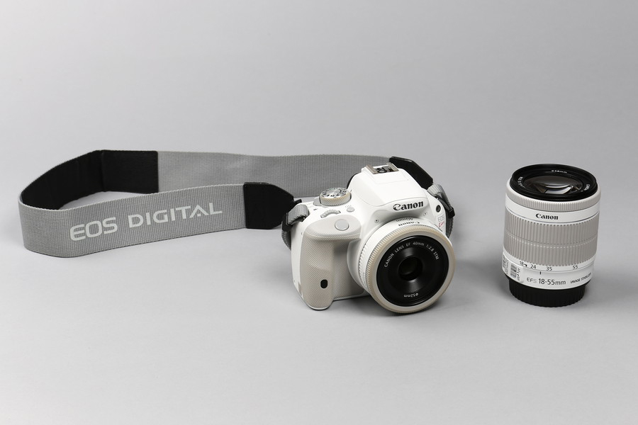 EOS Kiss X7にはホワイトカラーの「ダブルレンズキット2」が用意されています。グレーのストラップが付属するほか、同梱の2本のレンズ(EF-S18-55mm F3.5-5.6 IS STM とEF40mm F2.8 STM)もホワイトに仕上がっています