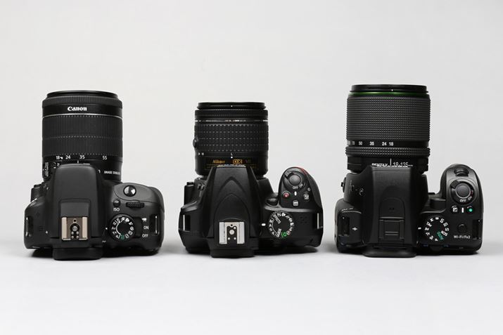 左からEOS Kiss X7、D3400、K-70。レンズキット付属のレンズを装着した際の奥行はD3400がもっとも短くなります